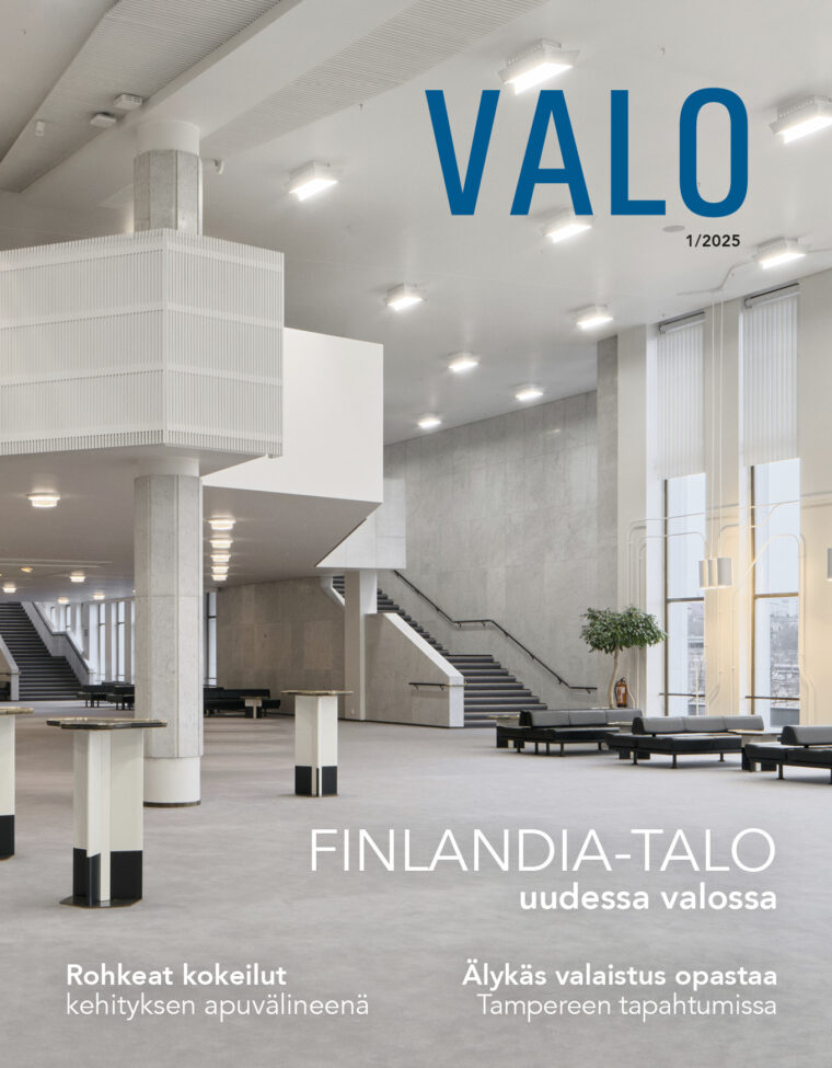 VALO 1/2025 -lehdessä esitellään mittavan perusparannuksen läpikäyneen Finlandia-talon modernisoituja valaistusratkaisuja. Lisäksi lehdestä voi lukea muun muassa, kuinka valaistuksella parannetaan Kannelmäen asemaympäristön viihtyisyyttä ja turvallisuutta sekä opastetaan Ratinan stadionin tapahtumakävijöitä.