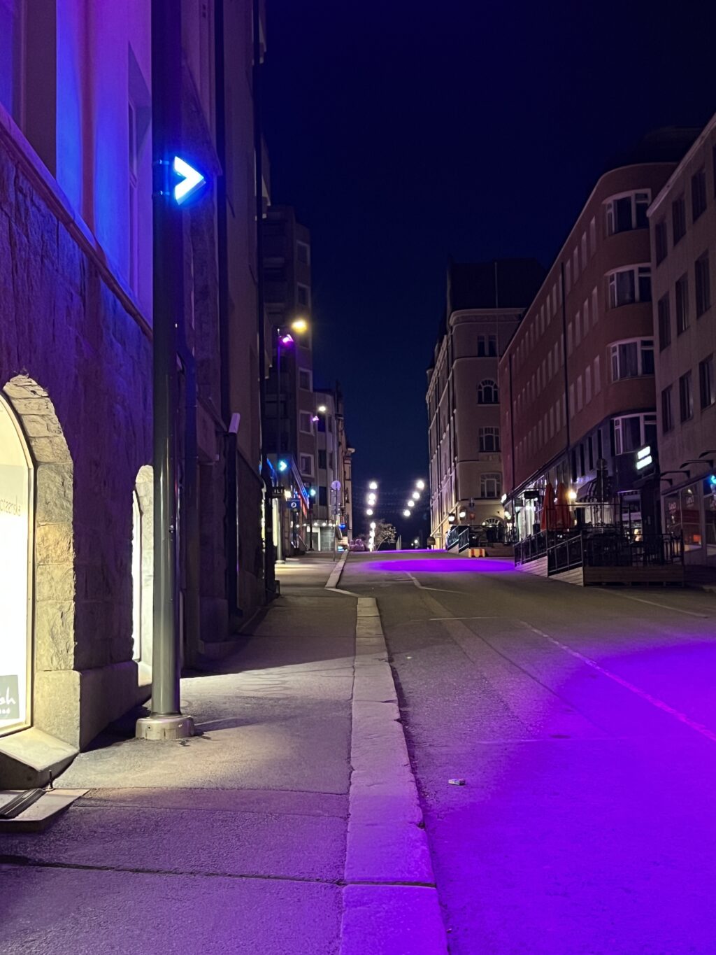- Sitten pysähdytään Aleksis Kiven kadulle, jossa ensimmäinen SURE-hankkeen valaistustoteutus (valo-opasteet, värivalaistus)